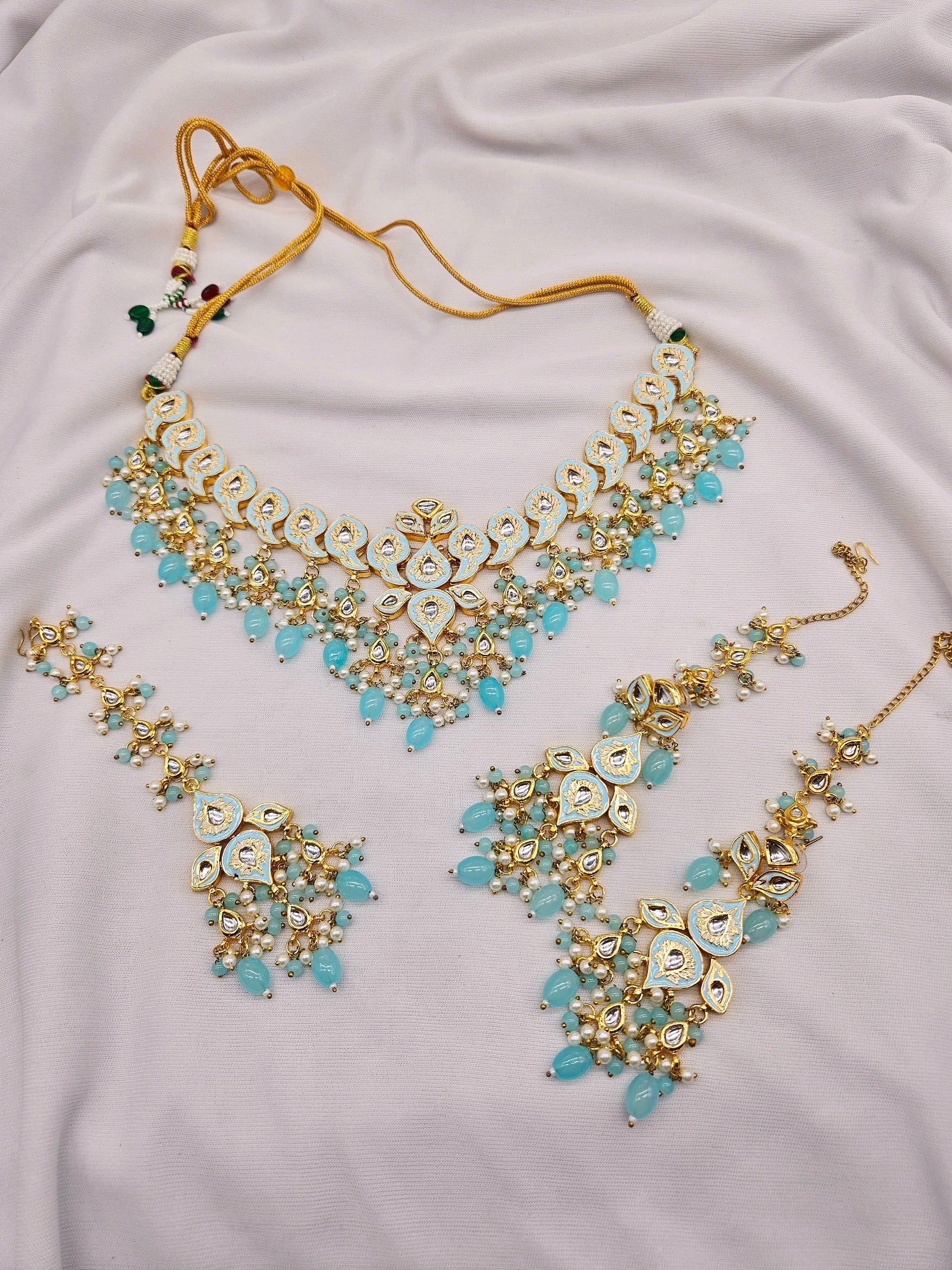 Radiate timeless charm ✨ with this handcrafted gold-tone necklace set from House of Vyoma. Featuring a statement necklace, earrings, maang tikka, and hand harness, the set is adorned with kundan-style stones 💎, aqua blue bead drops 💧, and delicate pearl hangings 🤍 that together create a graceful and regal silhouette.