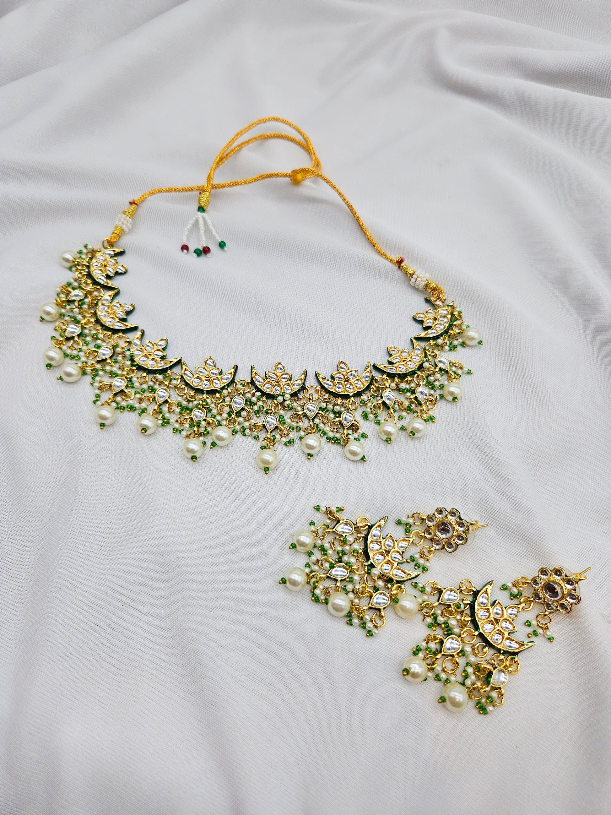 Crescent kundan motifs with green meenakari accents