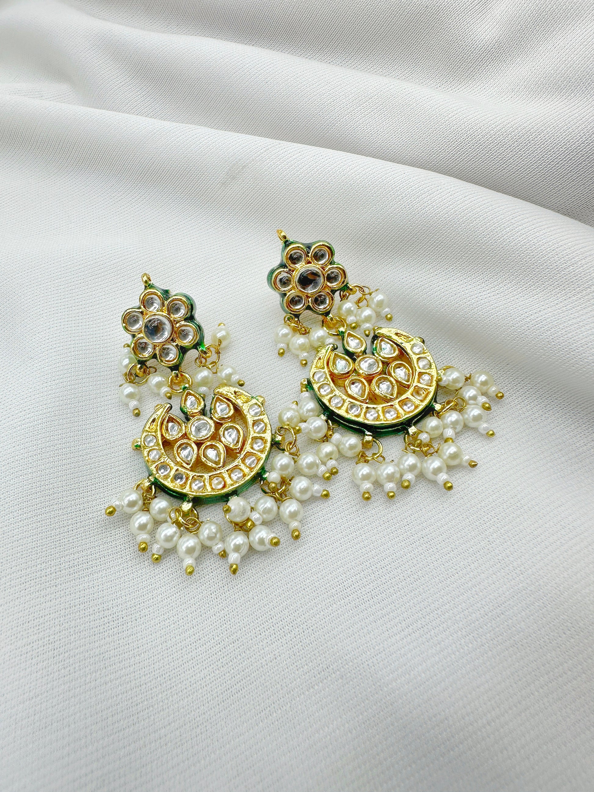 A tribute to celestial grace, this layered kundan necklace features crescent moon motifs 🌙 highlighted with kundan stones and delicate pearl tassels 🤍. Accented with green beads for contrast, the triple-layer design drapes gracefully, making it perfect for traditional ensembles. Matching earrings complete the look with timeless charm.