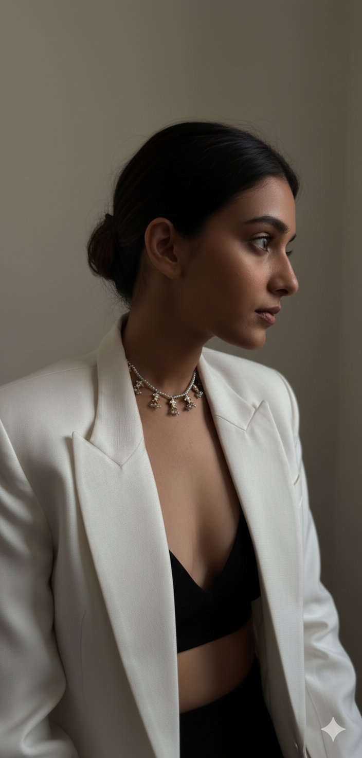 This pearl beaded choker necklace is adorned with gold plated Kundan charms, each accented with delicate bead hangings. The design combines traditional detailing with a refined aesthetic, making it versatile for styling with both ethnic and fusion outfits.