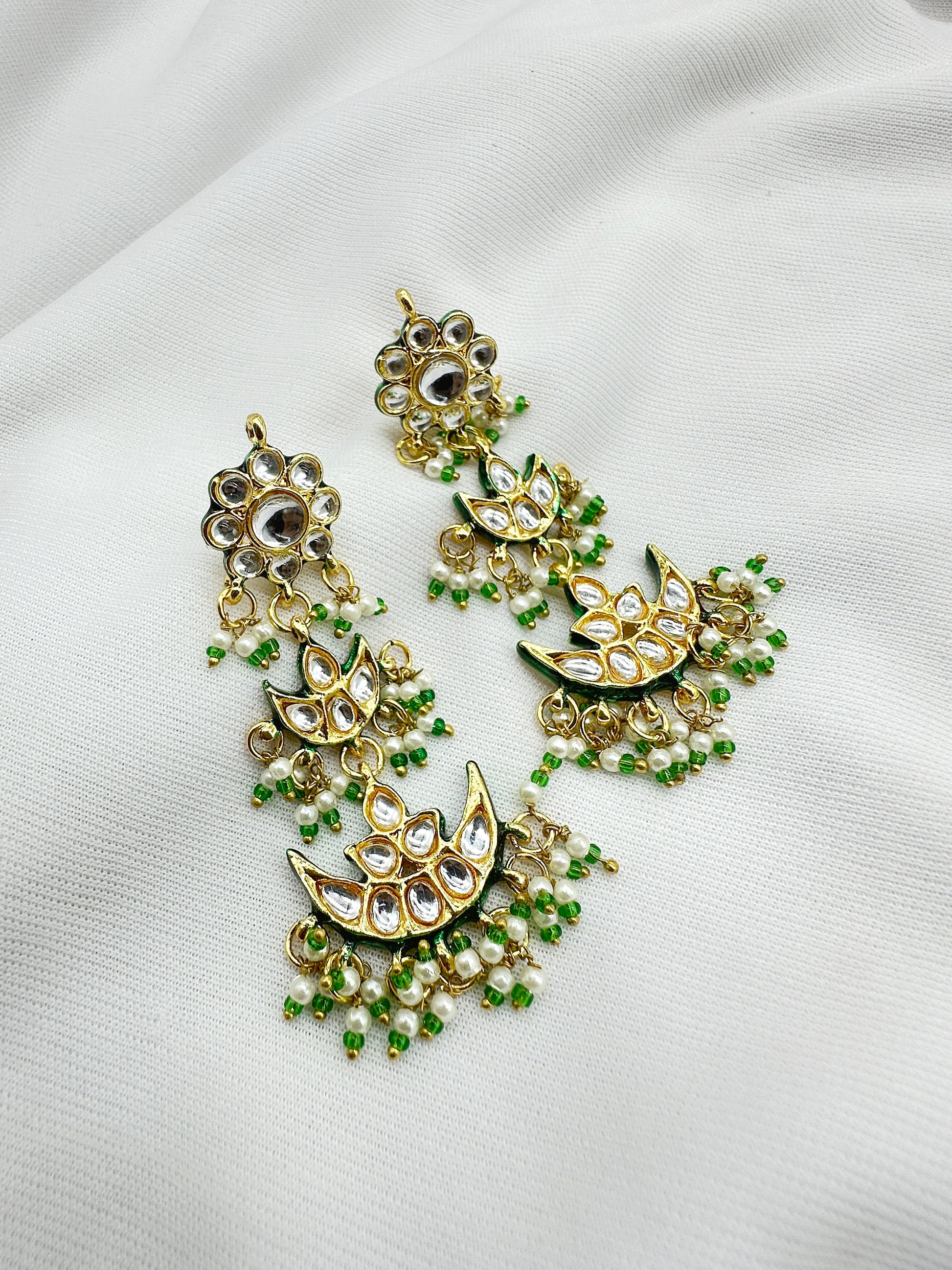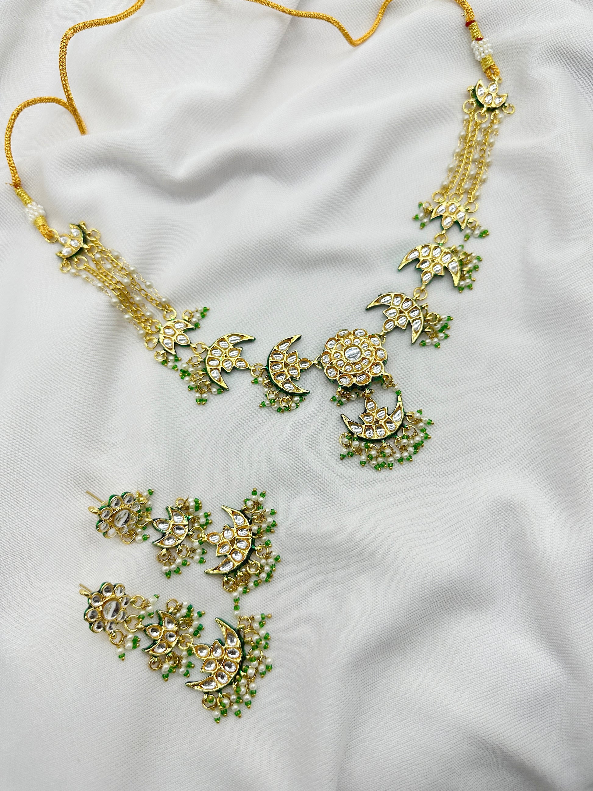 A jewel that captures the elegance of the night sky 🌙. This necklace is crafted with alternating crescent moon motifs and a central floral kundan design, highlighted with pearl drops and delicate green bead hangings. The matching earrings continue the celestial theme, completing a set that radiates festive charm.